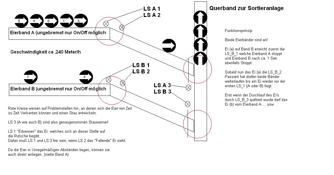 Hallo Franz-Peter, ja zu gegeben hab mich wohl etwas schwer verständlich ausgedrückt. Hab grad mal versucht eine Skizze zu Zeichnen. Es geht um meinen Hühnerstall und um Eierförderbänder, welche leider eher Subobtimal gebaut wurden. Ein umbau würde rund 80tausend Euro Kosten, kann ich mir derzeit einfach nicht leisten. Es handelt sich zwar nur um ein paar Eier täglich (ca. 100 Stück) die Kaputt gehen, aber für mich ist es eine Menge Geld am ende der Legeperiode. Wenn ich nur die Hälfte der Eier "Retten" kann, dann habe ich die Investitionskosten für C-Control+HW schnell wieder raus. Ich habe insgesamt 4 Anlagen mit je 2 Bändergruppen wie auf dem Bild zu sehen. Also müsste ich das was ich hier Plane am ende 8 mal aufbauen... aber erstmal mu� eines Funktionieren ;) Es handelt sich hier um sogenannte Verlege Bänder welche nur geringe menge an Eier Täglich führen nämlich dies die ein paar Hennen nicht in die Nester gelegt haben. Diese Verlegebänder sind 7cm Breit und enden an einem leicht abschüssigen U-Profil welches die Eier dann auf das Querband bringt. Baubedingt kommt es an den �bergängen von Zeit zu Zeit zu Staus, zum einem weil doch mal zu viele Eier direkt hintereinander kommen zum anderem weil auch mal eine halbe Ei-Schale vorliegt. Die nicht all so gut Rollen mag, wie man sich vorstellen kann. Wenn es zu so einem Stau kommt, drücken die nachfolgenden Eier sich zum teil Kaputt oder vom Band. Rührei was ich nicht Verkaufen kann. Die bänder haben laufen mit ca. 240 Meter pro Stunde. Da sich das alles im Stall passiert und erst da über das Querband in die Sortierhalle kommt, welches ca. 50 Meter entfernt ist, ist ein ewiges Hin und her gerenne um zu schauen ob alles Läuft sehr zeitaufwendig und umständlich. Nur Sensoren an den Problemstellen zum erkennen eines Staues reichen leider nicht, da auch mal 10-60 Eier hintereinander vorkommen, dies würde bedeuten das ca. 5 min die LS1 aktiv wäre deswegen die LS2, die ein "fallen" erkennen soll, passiert dies nicht, mu� an LS1 ein Stau vorliegen. Sicher man könnte ggf. LS2 weglassen und nur an LS3 ermitteln ob das Ei angekommen und durchlaufen ist, aber bei ca. 4 meter weg würde die anlage wiederum zu lange stehen und die Arbeitszeit fast verdoppeln was wiederum Lohnkosten verdoppeln würde. deswegen ist LS2 für mich wohl als effektiv lösung.... ls1 Sperrt wenn ei vorbei, ls2 gibt band wieder lauf bis ls1 wieder aktiv ist, erst der impuls von ls3 lässt dann das nächste wartende ei von LS1 fallen... Kurz ls2 lässt nur im zweifel vorrücken bis ls1 ls3 gibt den Fall von ls1 frei. Ok in dieser Betrachtungsweise, fällt mir auf das es doch möglich ist das 2 LS aktiv sein können pro gruppe... Ist nicht leicht es zu erklären, aber vielleicht verstehst du das nun etwas besser. Gru� Jürgen > Hallo Jürgen, > so ganz habe ich nicht verstanden wie das ganz funktioniert und wie die Lichtschranken angeschlossen > sind. Auch verstehe ich nicht, was Du in diesem Zusammenhang mit den Timer-IRQ's machen möchtest. > Wenn von Messpunkt A bzw Messpunkt B jeweils immer nur eine der 3 LS aktiv ist, würde ich sie > hardwaremä�ig verodern und jeweils auf einen externen IRQ-Eingang legen. Dann löst die LS direkt > einen IRQ aus, und Du kannst die Auswertung dazu starten. Alternativ dazu könntest Du sie auch > im 10ms-IRQ des Systems pollen. > Die IRQ-Routinen selbst sollten immer möglichst kurz sein ( keien Delays oder Ausgaben) und keine > (de)aktivierung des IRQ selbst enthalten (s. Kommentar unten). > Gru� > Franz-Peter > > > Hallo Franz-Peter oder gern auch jemand anderes... > > > > ich habe folgendes Problem ;) > > > > Ich möchte/muss insgesamt 6 Lichtschranken auswerten, wobei je 3 zu einer Gruppe Gehören. > > Anders Ausgedrückt, 2 Signalauslöser mit je 3 Lichtschranken in Ihrer "Umlaufbahn" > > > > Es können also maximal 2 Sensoren gleichzeitig ausgelöst werden, je Signalausgeber wiederum nur einer. > > > > MesspunktA.1 MesspunktA.2 MesspunktA.3 > > und > > MesspunktB.1 MesspunktB.2 MesspunktB.3 > > > > Ich möchte das gern über 2 Einzelne Interrupts lösen. > > > > Frage 1. Welche Interrupts (Timer) kann ich verwenden, blicke da irgendwie nicht so recht druch. > > > > Frage 2. Ist es Sinnvoll den IRQ am Anfang der IRQ-Funktion zu Deaktivieren und zum Ende wieder auf > > sich selbst zu legen, um zum Beispiel den wiederholten Aufruf per IRQ zu vermeiden solange die Funktion > > nicht verlassen wurde? > > > > Schematischer Quelltext: > > IRQ_A(Void) > > { > > Irq_SetVect(INT_TIM2COMP,0); 'Abschalten des IRQ's ??? Ist das richtig so??? > >>>nein, IRQ kann sich nicht selbst unterbrechen > > int irqcnt_a; > > irqcnt_a=Irq_GetCount(INT_TIM2COMP); > >>> das muss ganz am Ende stehen (nach MESSENSOREN PR�FEN) > >>> �ber den Wert kannst Du gegebenenfalls festtellen, ob der HW-IRQ während der Abarbeitung > >>> erneut ausgelöst hat. > > > > MESSENSOREN PR�FEN und den IRQ wieder Aktivieren > > > > Irq_SetVect(INT_TIM2COMP,IRQA); > >>> s.o. > > } > > > > IRQ_B(Void) > > { > > Irq_SetVect(INT_TIM3CMPA ,0); 'Abschalten des IRQ's ??? Ist das richtig so??? > > int irqcnt_b; > > irqcnt_b=Irq_GetCount(INT_TIM3CMPA); > > > > MESSENSOREN PR�FEN und den IRQ wieder Aktivieren > > > > Irq_SetVect(INT_TIM3CMPA,IRQB); > > } > > > > > > IRQ_INIT(Void) > > { > > Irq_SetVect(INT_TIM2COMP,IRQA); > > Irq_SetVect(INT_TIM3CMPA,IRQB); > > } > > > > Oder kann ich den INT_TIM3CMPA nicht dafür benutzen. > > > > Ich blicke da irgendwie nicht wirklich durch mit den Timern, Sorry! > > > > Danke > > > > Gru� Jürgen > > > > > > > > > > > > Hallo Franz-Peter, > > > > > > > > bei der verwendung von Lichtschranken/Gabel/Brücke/Reflex.... mu� ich mir erst noch eine saubere > > > > Schaltung heraussuchen, da meine Impulse ca. 20ms Aktiv sind denke ich das ich eine Impulsverlängerung > > > > zusätzlich verbauen mu�, aber auch bei der Auswahl der Sensoren bin ich mir noch nicht so sicher. > > > > ich tendiere für meine Zweck