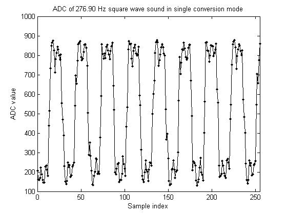 > Hello Pepe, > > of course I would like to know more about. The Free-Running-Mode > has the disadvantage that we must poll over the interrupt flank, > because there is no way to define a real interrupt routine. > That causes a lot of cpu-noise. Maybe we put the cpu into > ADC-Sleep-Mode and wait for the result. In ADC-Sleep-Mode we can > use a faster ADC-Clock. Please take a look at the program below. > > DancingProBot-0.01 > > GruÃ? Torsten Hi Torsten, Im am afraid the other running modes you programmed do not work so well as the free running mode. - ADCaptureRun runs 15% slower than ADCaptureRunFree and shows some glitches. - ADCaptureRunQuiet shows strange behaviour. See attached figures. What do you think? What might work is an 'ADCaptureRunFreeQuiet'. Regards, Pepe Sound data in single conversion mode.JPG: Sound data in single conversion quiet mode.JPG: | ||